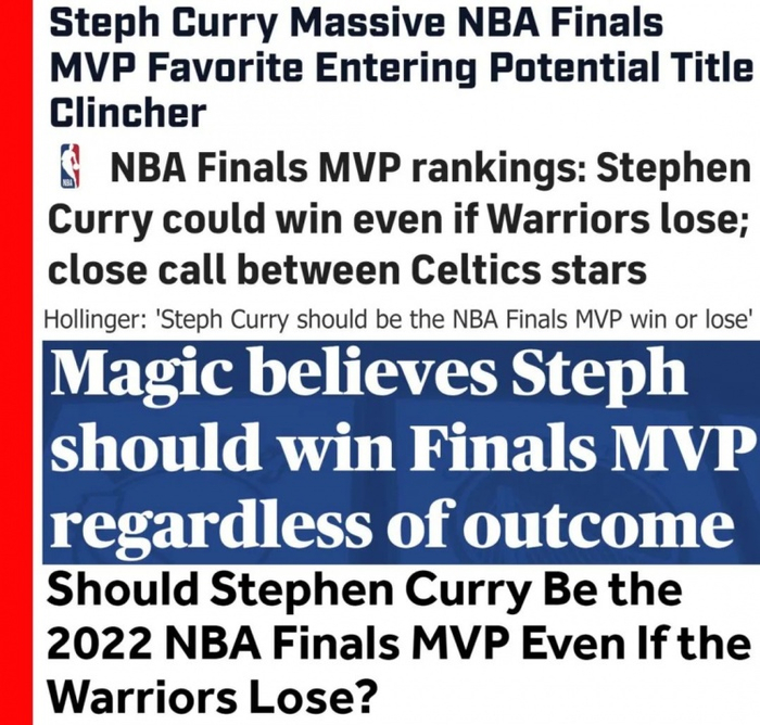 早在总决赛打成2-2时,已经有多家大媒体提出,库里夺得FMVP的可能性最大,这其中包括CBS、ESPN和B/R等。接着“魔术师”约翰逊直接站台,说不管结果如何,FMVP都应该是库里。数据专家、曾提出多项经典高阶公式并因此当过灰熊副总裁的霍林格也说,不管勇士输赢如何,库里都应该当选FMVP,他说:
