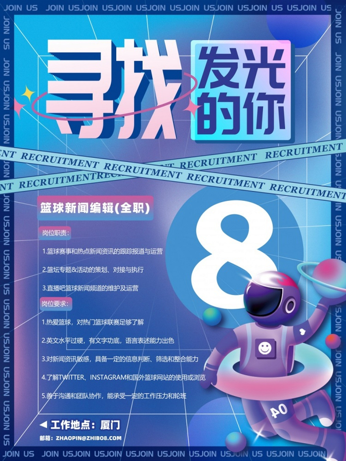 因公司发展需要,直播吧现招聘全职篮球新闻编辑,欢迎小伙伴们投递简历,加入我们的团队,一起看球打球评球,就等你的行动!