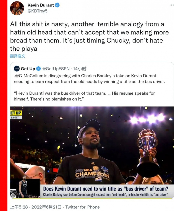 那些头部评论员也借此刺激杜兰特,比如前两天巴克利说,杜兰特必须作为“大巴司机”去夺一个总冠军。这里的“大巴司机”,意思是团队核心,头号领袖,巴克利暗讽杜兰特那两次夺冠是抱团所得。