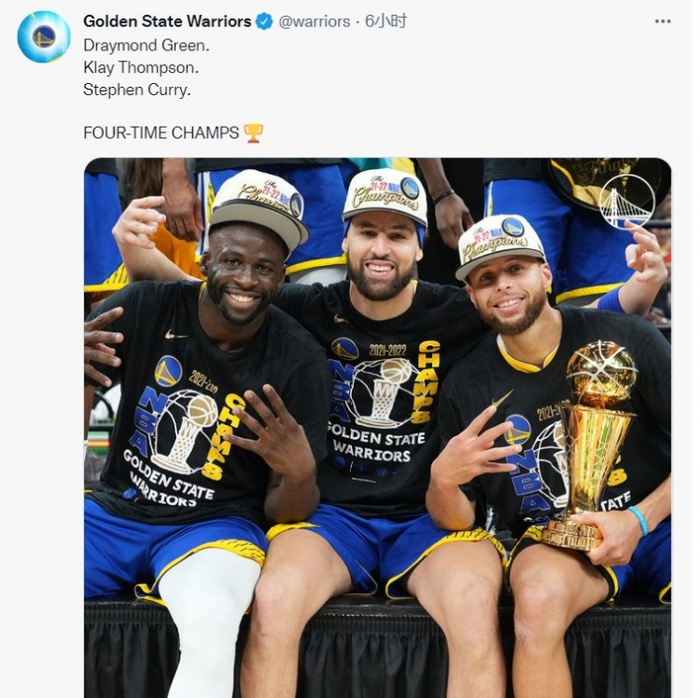 勇士官推今日晒出库里、克莱、追梦的捧杯合照,并写道:“德雷蒙德-格林、克莱-汤普森、斯蒂芬-库里,四次总冠军! 🏆”