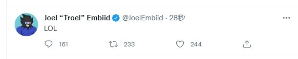 76人球星恩比德更推写道:“LOL(指大声笑)!”