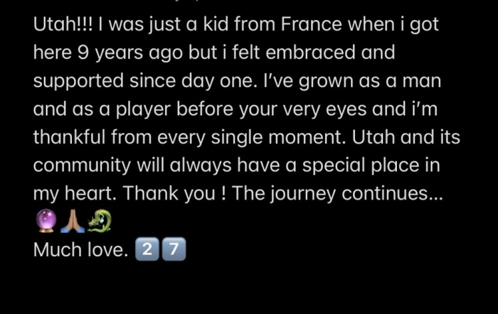 在你们的见证下,我成长为一个男人,一个球员,每一刻我都心存感激。犹他州和这里的社区将永远在我心中占据特殊的位置。谢谢你们,旅程仍在继续。太多的爱!”