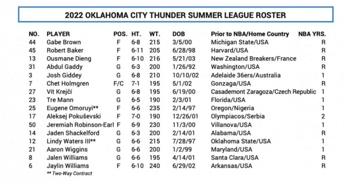 直播吧7月5日讯 雷霆官方晒出了他们夏季联赛的官方名单,新科榜眼霍姆格伦在列。