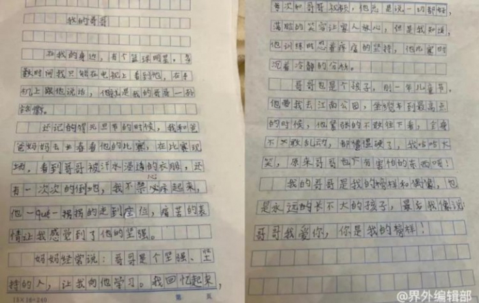 这是孙铭徽小学生妹妹写的作文,她把哥哥视为榜样和偶像。在过去的一个赛季中,孙铭徽带领广厦打入CBA总决赛,在胡金秋和赵岩昊重伤缺席的情况下,顽强地和辽宁队抗衡。