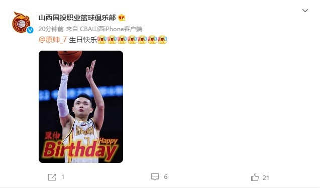 直播吧7月18日讯 今天是原帅28岁的生日,山西男篮官博为其送上祝福。