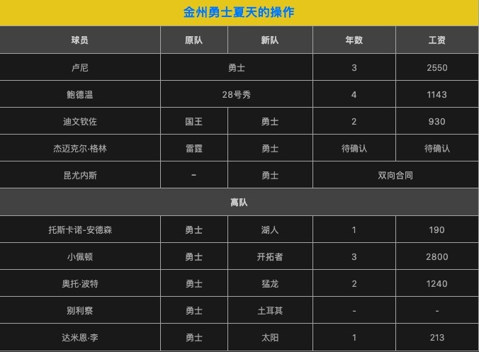 那些为夺冠做出过重大贡献的角色球员,除了伊戈达拉还飘着,都早早地确定了新的下家,显然,这是勇士队提前通知他们了。但放走了这些功臣,又没有大手笔引进,到现在除了续签卢尼,就是签了迪文钦佐和准备签杰迈克尔,另有一名后卫昆尤内斯拿了双向合同。