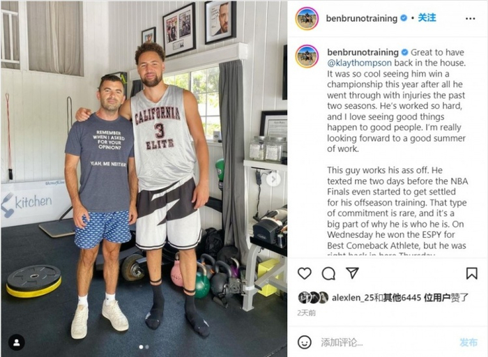 Bruno写道:很开心克莱回到我们的训练馆。在他经历了过去两个赛季的伤病之后,看到他今年赢得了冠军真是太酷了。他训练非常努力,我喜欢看到好事发生在好人身上,我真的很期待这个美好夏天的工作。