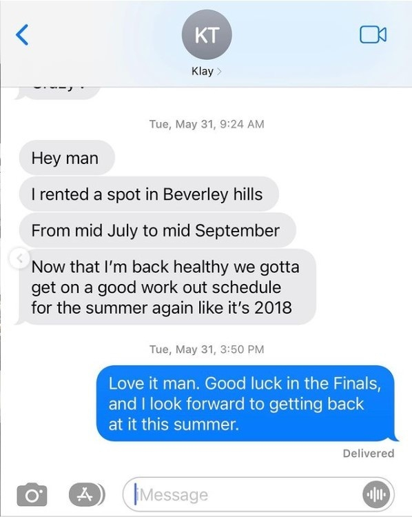 短信中汤普森写道:嘿兄弟,我预定了比弗利山庄(加州城市)的一个位置,从七月中旬到九月中旬。现在我恢复健康了,这个夏天我们要将训练提上日程,就像2018年那样。