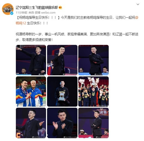 原文写道:“今天是我们的主教练杨鸣指导的生日,让我们一起祝杨鸣生日快乐!!!祝愿杨导新的一岁,事业一帆风顺,家庭幸福美满,更加英俊潇洒!和辽篮一起不断进步,取得更多成绩和荣誉!”