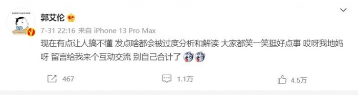 几天之前,郭艾伦就曾经吐槽,“现在有点让人搞不懂,发点啥都会被过度分析和解读。大家都笑一笑挺好点事,哎呀我滴妈,留言给我来个互动交流,别自己合计了。”