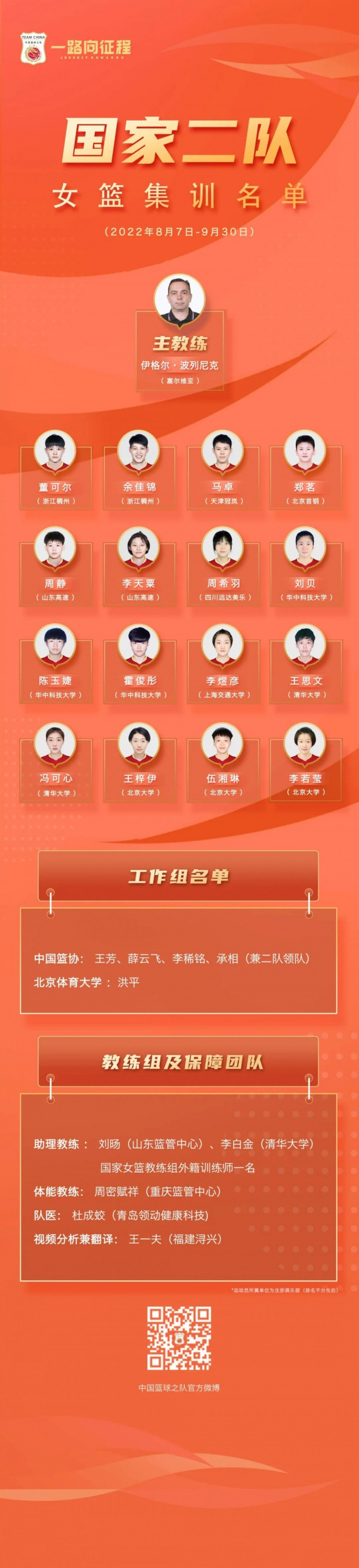 中国女篮二队集训16人名单:周希羽在列 伊格尔-波列尼克任主教练