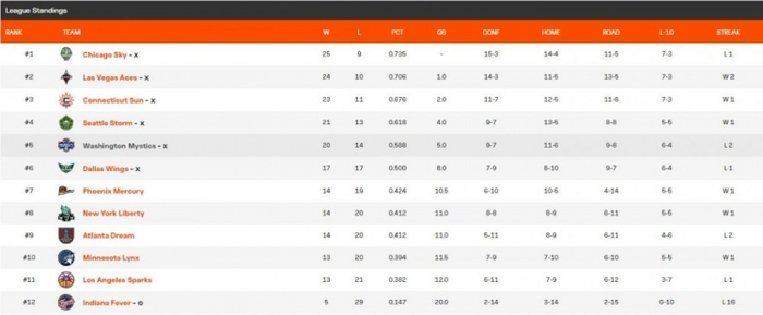 天空、王牌、太阳、风暴、神秘人和飞翼已经锁定了季后赛资格,剩余两个席位则有5支球队在争夺,分别是水星、自由人、梦想、山猫以及火花。