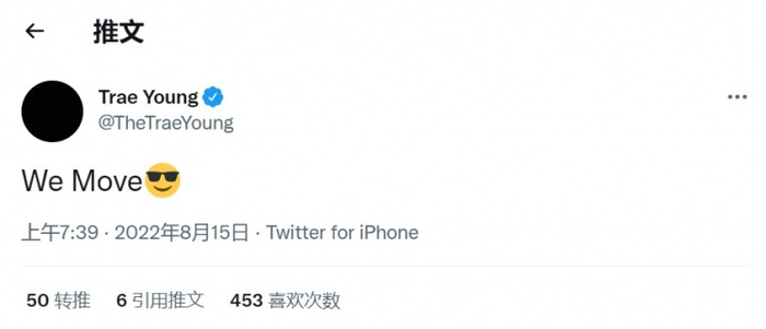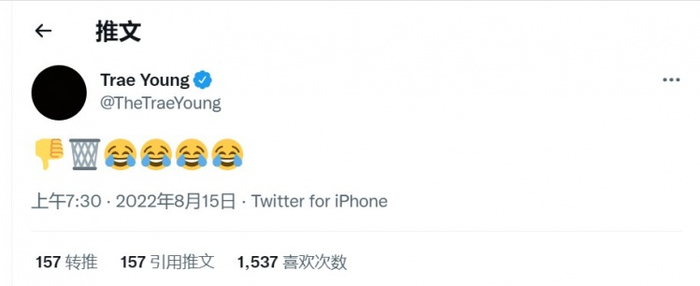 消息爆出后,特雷-杨更新社媒,发了一个大拇指朝下、一个篮筐和4个笑哭表情。