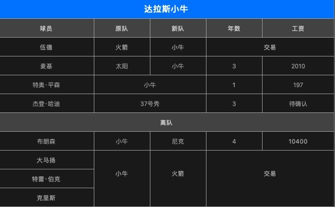 新赛季花钱最多的队,前五名分别是勇士、快船、篮网、雄鹿和奇才,小牛虽然超过工资帽将近4800万,却只能排到第11。这个夏天小牛队最大的变动,是失去了控卫布朗森,眼睁睁看着他被纽约尼克高调签走。