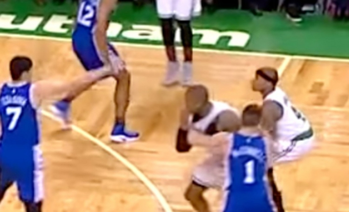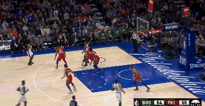 同样的这个战术,2017-2018赛季季后赛对阵雄鹿时,霍福德选择了背身单打,期间杰伦试图空切,但是被封堵,如果空切形成,霍福德极有可能将球传给他。