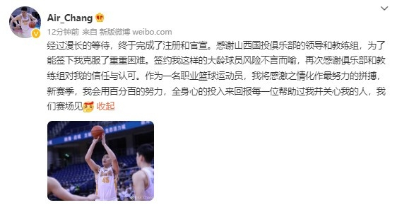 直播吧9月1日讯 今日,山西男篮球员常林更新了个人微博。