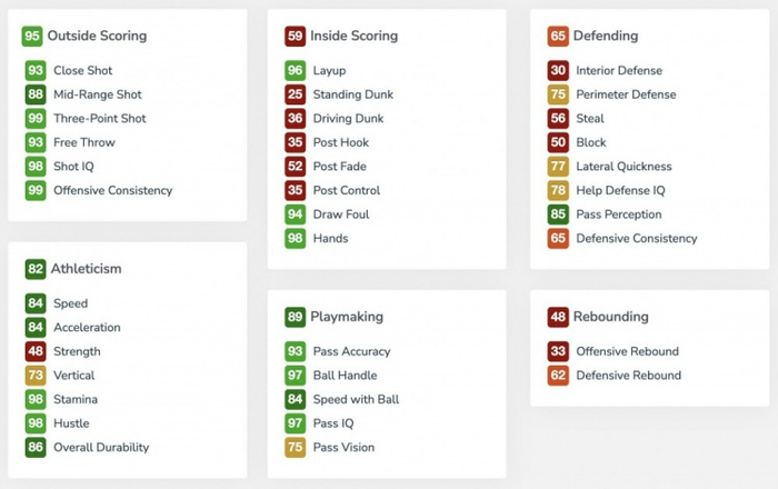 值得注意的几项数值为:中投88、三分99、罚球93、速度84、加速84、强壮48、耐力98、上篮96、站扣25、冲扣36、控球97,前场篮板33、后场篮板62。