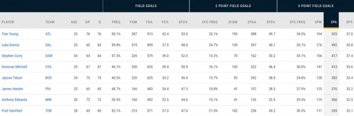 上赛季,只有3名球员运球后出手三分的次数比米切尔多,分别是特雷-杨、东契奇和库里。