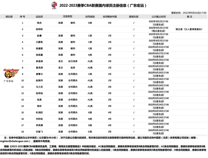 直播吧9月16日讯 CBA官方今天更新了广东宏远的国内球员注册信息,其中后卫徐杰和球队以B类合同续约5年。