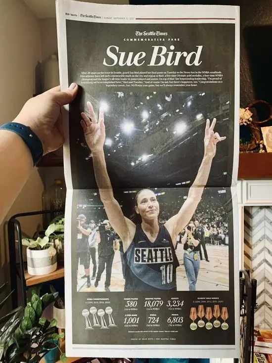 苏-伯德生涯的最后时刻定格在了2022年9月7日,她所率领的西雅图风暴总比分1-3不敌拉斯维加斯王牌止步于WNBA半决赛。这位即将年满42岁的老将也将告别赛场。同样是在半决赛失利,这一次没有戴安娜-桃乐茜起哄带着观众高呼“One more year”,这位历史上最伟大的女子控球后卫伴随着“Thank you Sue”的赞美走向了更衣室通道。