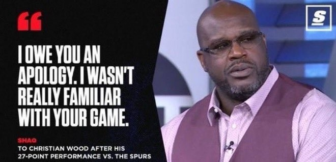 此前,伍德在对阵马刺的比赛中独砍27分,奥尼尔赛后对伍德说了如上这番话。