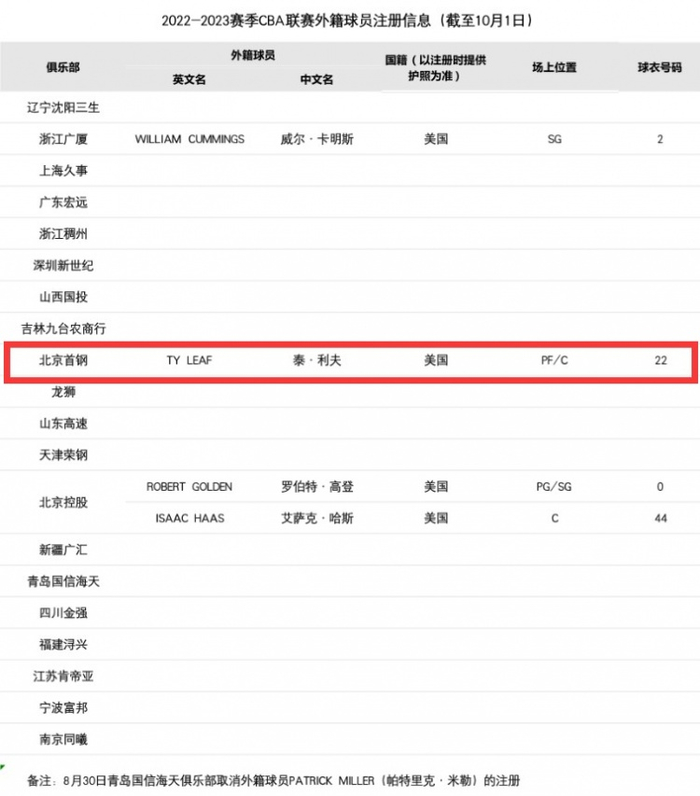 直播吧10月1日讯 根据CBA官网公布的信息,北京男篮已经正式签下泰-利夫。
