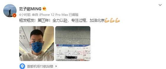 范子铭写道:“粗发粗发!第7年!全力以赴,专注过程,加油北京💪💪💪”