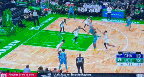 凯尔特人保护后场篮板后推进反击,黄蜂防守球员未能完成落位,普拉姆利选择用非正常动作进行阻碍,所以这是一个转换故意犯规;