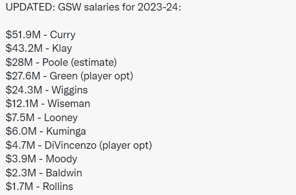 勇士队记Marcus Thompson II晒出勇士23-24赛季薪资明细: