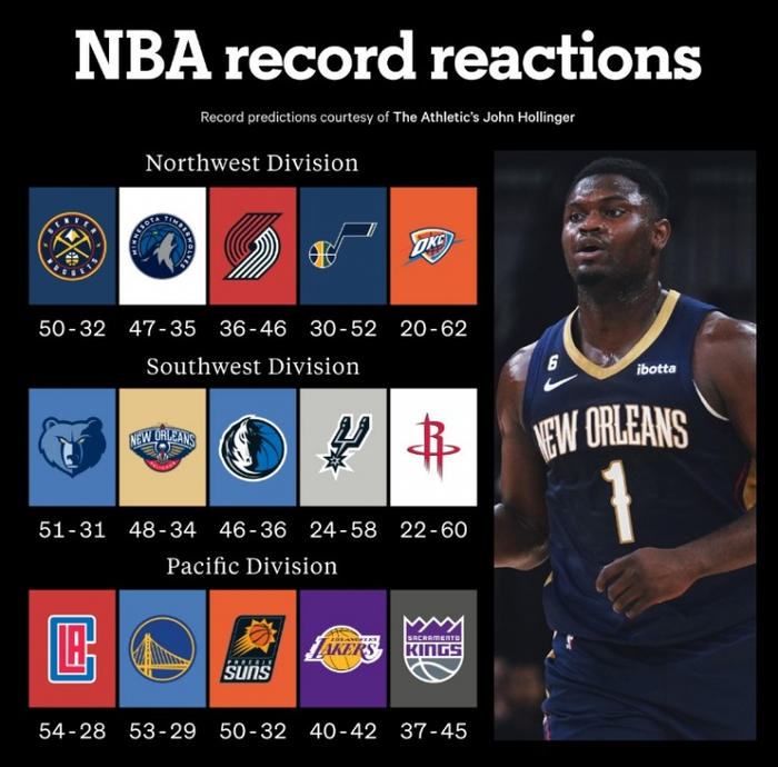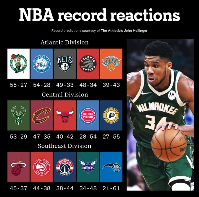 直播吧10月19日讯 今天,The Athletic专栏作家John Hollinger对各队新赛季常规赛的战绩进行了预测。