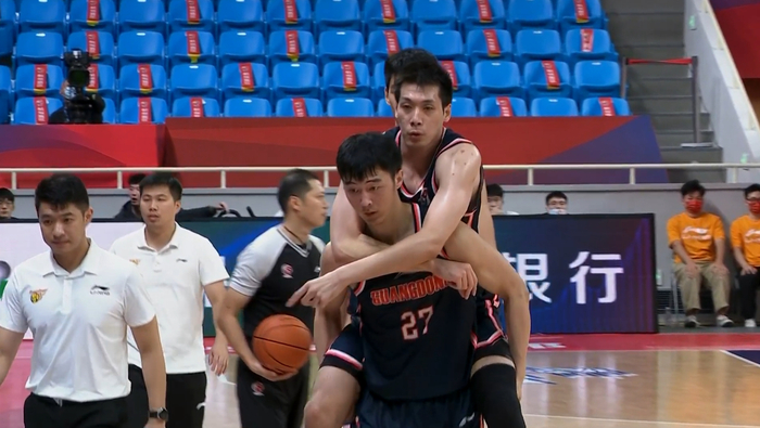 任骏飞在广东反击回合胡明轩被犯规进行罚球后,才被队友张明池背到替补席。