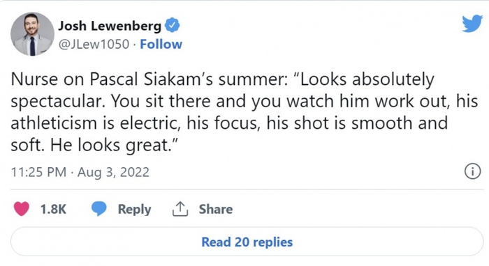 猛龙主帅纳斯在休赛期注意到了西亚卡姆的苦练,他说:“西亚卡姆看起来非常的壮观,你坐在那看他训练,看他的运动能力是如此出色,如此专注,投篮手型如此柔和,他看起来棒极了。”
