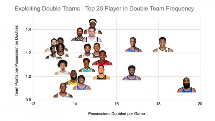 这些数据已经证明了西亚卡姆有串联组织的能力,除了约基奇这个BUG级的球员在,西亚卡姆已经是助攻方面数据最好的大个子,也超过了詹姆斯和巴特勒这两位以串联组织见长的锋线球员。在全联盟的被包夹次数上,西亚卡姆排名前二十,而他被包夹后球队的每回合得分,却是全联盟第一。