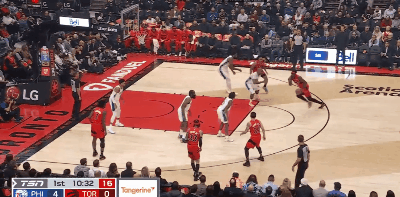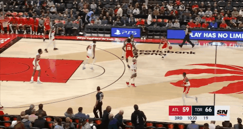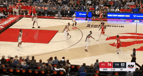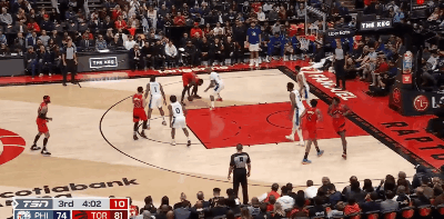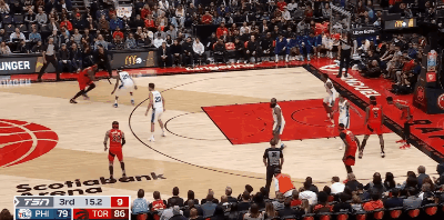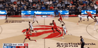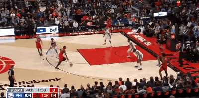 另一种是利用自身突破能力,吸引对方包夹后为猛龙外线球员创造三分空间。猛龙的五大阵容中有三个都有三分能力,空间并不差。西亚卡姆光靠运动能力生突也能创造不少机会。