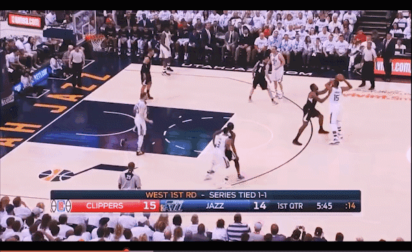 上图是16-17赛季爵士对阵快船的季后赛里的一个战术,海沃德无球在低位制造错位,接球直接转身投射得手——这个锋线战术在犹他爵士队非常常见。
