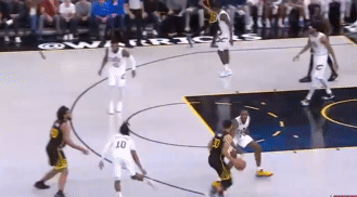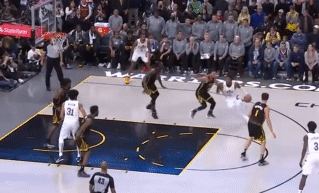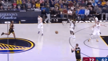 第三节末一口气带起四个三分球将眼看要输的球挽回来,第四节最后1分18秒得到10分锁定胜局——这是库里的进攻。