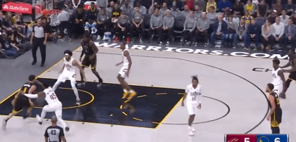 大部分时间,只追梦/卢尼一个在场,内线缺人,故勇士减少了换防。维金斯防米切尔或加兰德,都偶尔退一步。