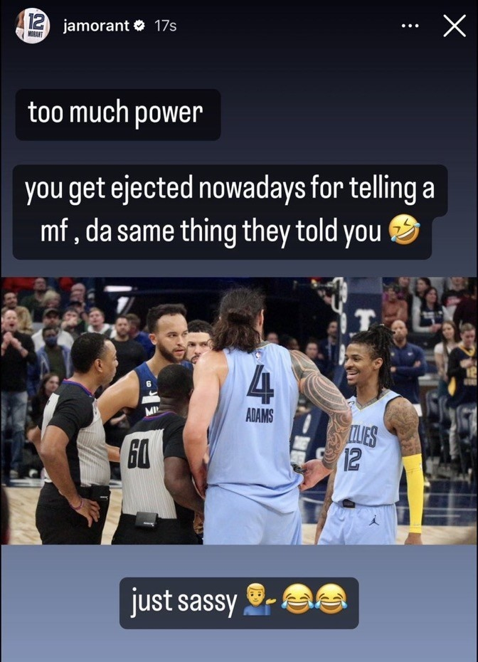 赛后莫兰特更新INS谈到此事,他写道:“(裁判的力量)太强大了吧。如今因为对裁判讲了他们对我说的话就被驱逐🤣好粗鲁😂😂”