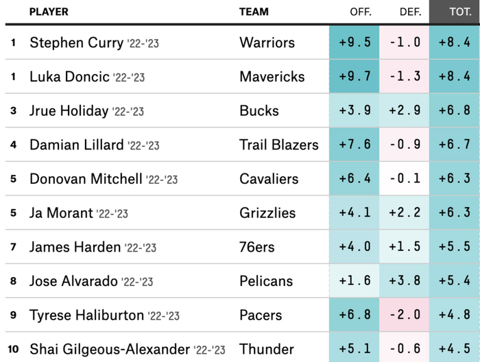 可以看出进攻影响力最高的是东契奇(+9.7),防守端则是阿尔瓦拉多(+3.8)。