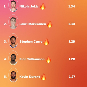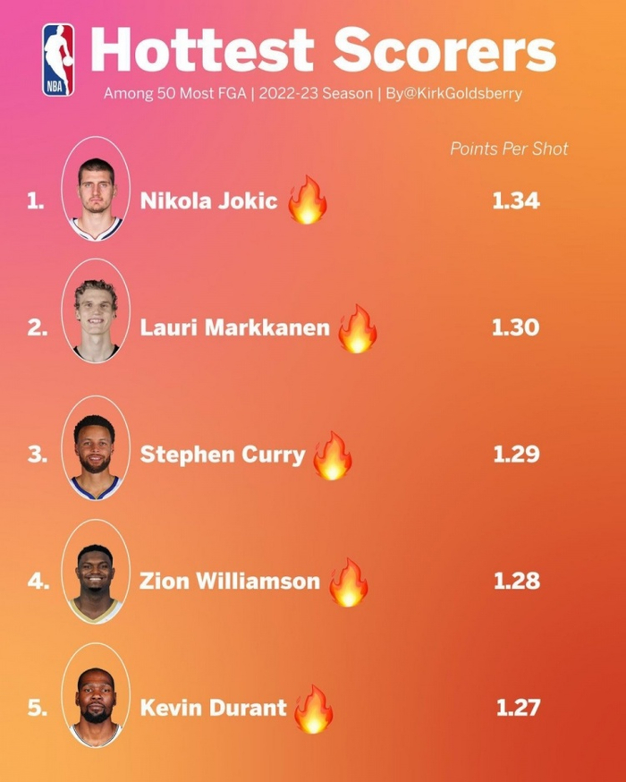 赛季平均每次出手得分前5:约基奇1.34分第一 库里第三 KD第五