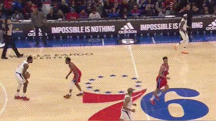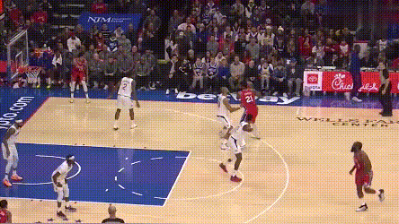 但哈登的确是改变比赛的重要球员。卡子哥赛后总结失败经验,指出了球队“退防不佳,进攻停滞”两个关键问题。卡子哥的判断很准,但快船退防不佳有一部分原因是,登哥和76人其他人在反击中优异的表现,比如这次反击,76人两个底角空间拉开充分,快船上线三人堵中路,被哈登准确阅读拆解。