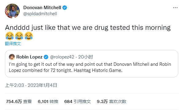 米切尔则是回复道:“就像这样,我们今天早上接受了药检😂😂😂”