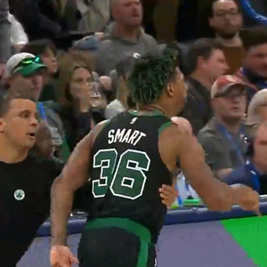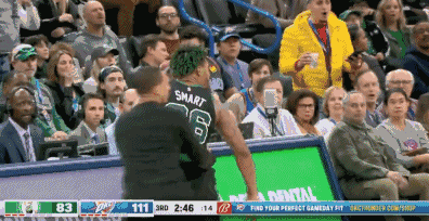 比赛第三节,此前已经领到一次技术犯规的斯玛特对裁判的一次判罚感到不满(凯尔特人本来获得两次罚球机会,裁判改判为提前犯规,无罚球),怒喷裁判被教练马祖拉一把抱住。