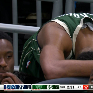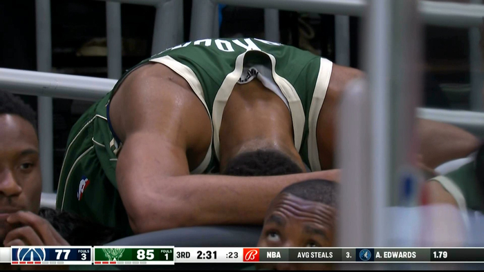 比赛第三节还剩2分31秒时,字母哥被拍到趴在场边的椅子上。