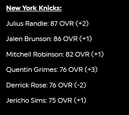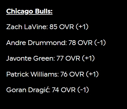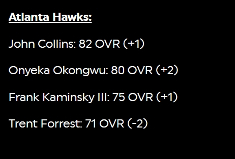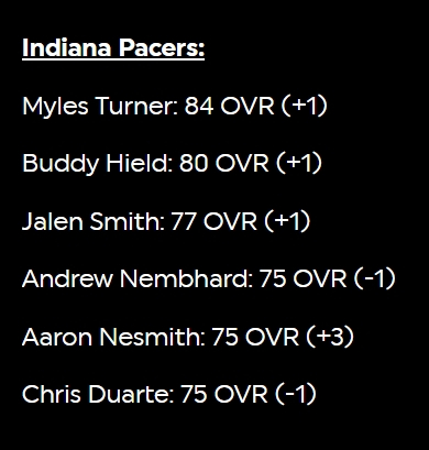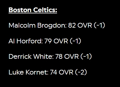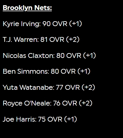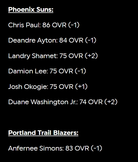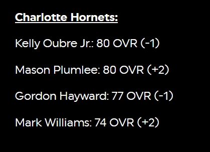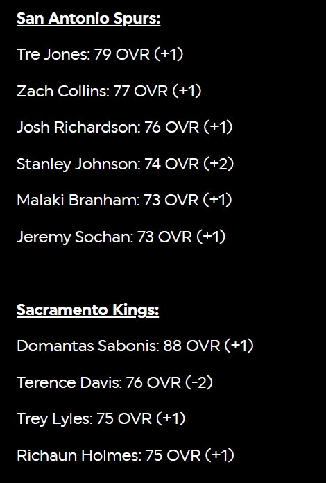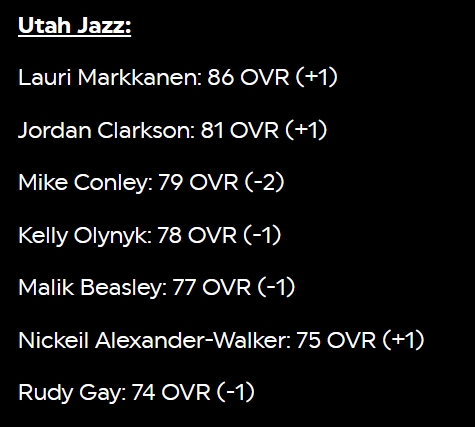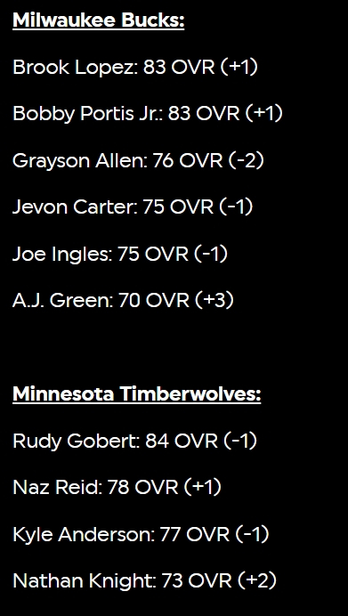 其他一些值得关注球员的能力值变化——西亚卡姆88(-1)、萨博尼斯88(+1)、兰德尔87(+2)、布伦森86(+1)、马尔卡宁86(+1)、拉文85(+1)、希罗85(+1)、贝恩84(-2)、戈贝尔84(-1)、普尔84(+1)、本-西蒙斯80(+1)、威斯布鲁克80(+1)、托马斯-布莱恩特80(+3)、沃尔79(-2)