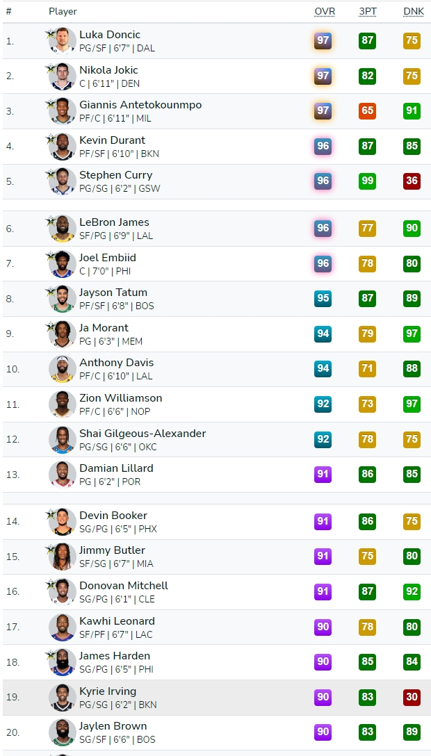 2K能力值更新:东契奇约基奇字母并列第一 登欧威茶+1 小卡保罗-1