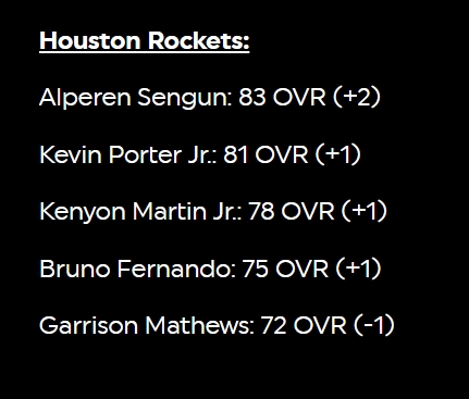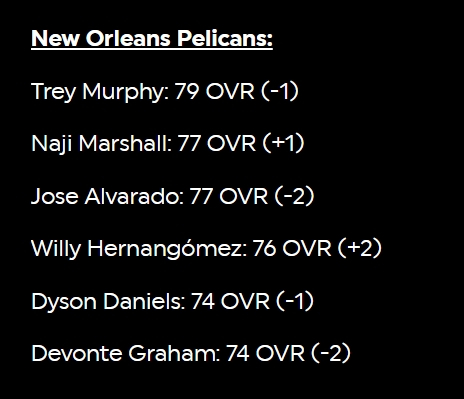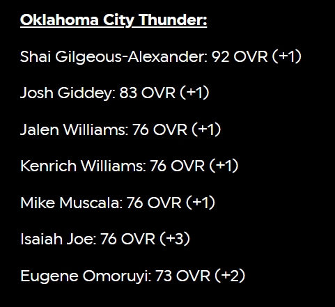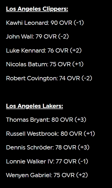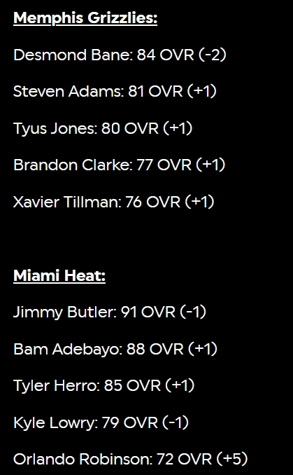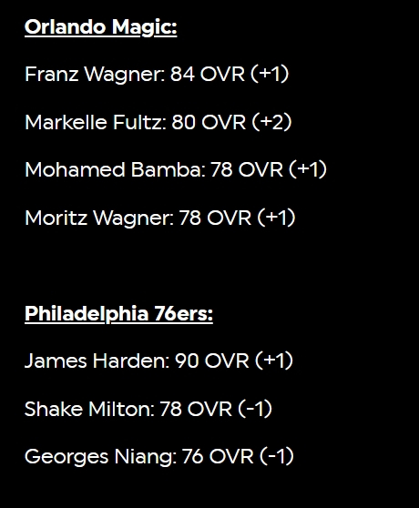 其中东契奇和约基奇能力值均+1来到97,与字母哥并列成为能力值最高的三位球员。亚历山大能力值+1来到92,巴特勒能力值-1来到91,米切尔能力值+1来到91,莱昂纳德能力值-1来到90,哈登能力值+1来到90,欧文能力值+1来到90,保罗能力值-1来到86。