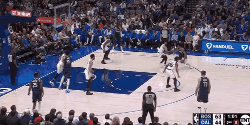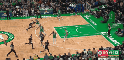 他运球过了半场,在进攻时间还有20秒的情况下,出其不意的一个沉肩加速,过掉了塔图姆,尽管塔图姆第二反应很快追在身后,可乔治的面前还是空无一人。等等,怎么一个后卫跑了过来?
