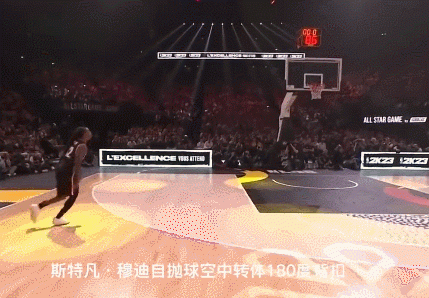 第二个登场献技的是斯特凡-穆迪,他上演了一记自抛球空中转体180度背扣。这位身高仅有1.78米的穆迪,效力于法国的Chorale Roanne队,曾转战过多个联赛,曾在2018年夺得希腊全明星的扣篮冠军。