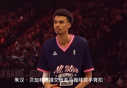 第三位出场的庞斯则是聘请了2023年NBA状元秀热门、2米24的文班亚马,来了一记飞跃文班亚马双手爆扣,此球得手后,文巴亚马也是张开双臂,一脸惊讶。